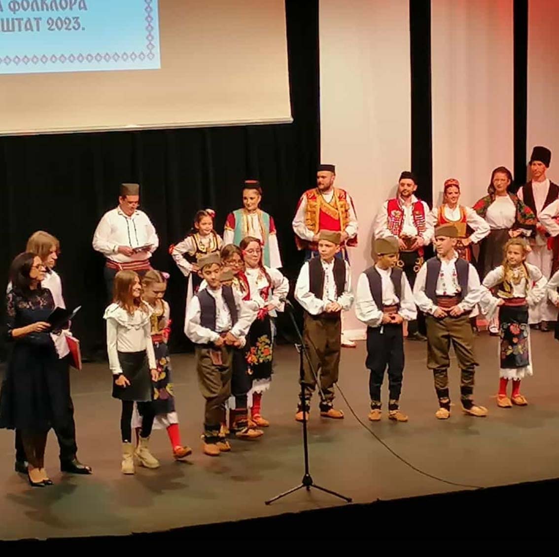 Pesma “Domaćine” koju je izvela Anastasija Dašić glasno se orila kao dobrodošlica svima u teatru. Potom su viđene prelepe koreografije iz raznih srpskih krajeva u izvođenju svih društava. Drugi blok počeo je monologom glumca, Nikole Stošića koji nas je na duhovit načini podsetio gde su naši koreni. Njegove reči su potkrepljene tačkom koja je usledila. Folkolraši domaćina izašli su u nošnjama iz svih krajeva odakle potiču. Šarenilo na bini. Narodna nošnja Vojvodine, Šumadije, jugoistoka Srbije, Kosova i Metohije, Republike Srpske, Korduna, Slavonije i Like, Crne Gore.