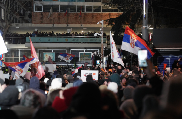 Policija, koja je do sada bila diskretna ili odsutna u povorkama demonstranata, sada je vidljiva, sa šlemovima i opremom za razbijanje demonstracija, koje su, kako navodi AFP, „mirne i masovne“ a traju od pada nadstrešnice na železničkoj stanici u Novom Sadu 1. novembra, kada je stradalo 15 ljudi.
