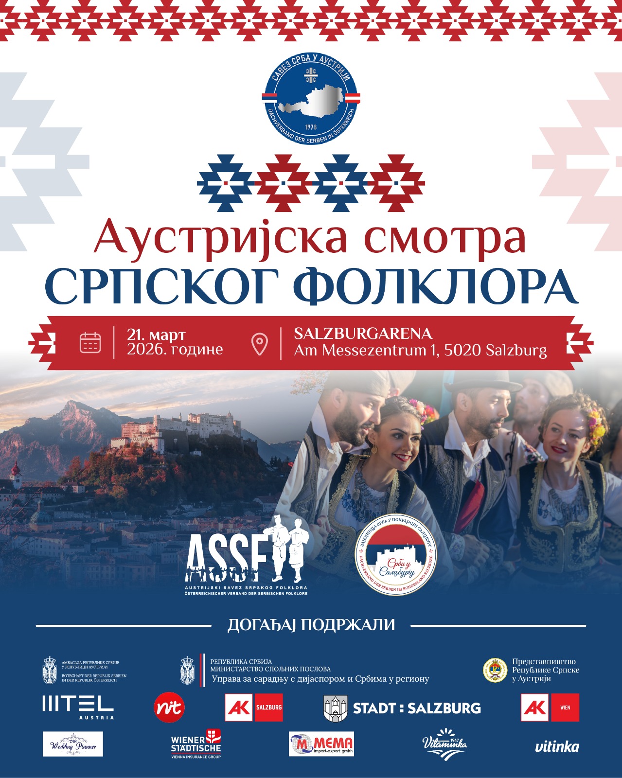 Savez Srba Austrije u saradnji sa Austrijskim savezom srpskog folklora i domaćinom Zajednicom Srba u Salcburgu najavljuju Austrijsku smotru srpskog folklora, značajnu kulturnu manifestaciju koja će okupiti folklorna društva i izvođače iz cele Austrije.