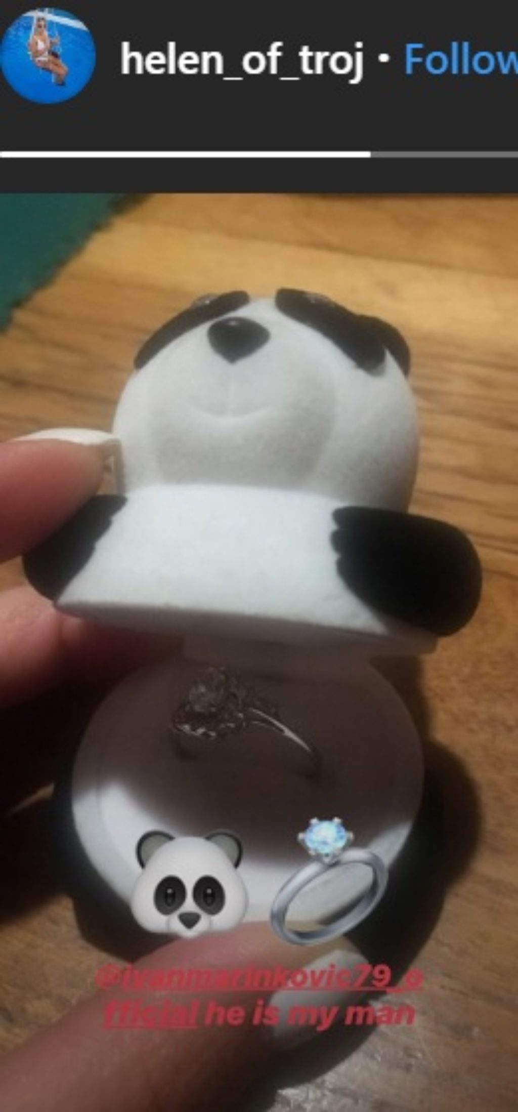 Naime, Jelena se na svom profilu pohvalila vereničkim prstenom i tako svima otkrila da ju je Ivan pitao da mu bude žena. Mnogima je za oko zapala neobična kutijica u obliku pande u kojoj se nalazio verenički prsten. Ubrzo usledile čestitke, a ostaje da vidimo kada će par zakazati venčanje.