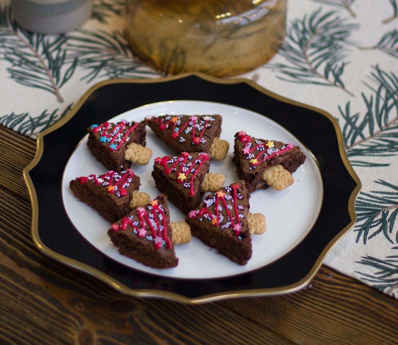 U činiju staviti čokoladu i puter i na laganoj vatri otopiti, dobro promešati i ostaviti malo da se prohladi. Pomešati brašno sa svim začinima i praškom za pecivo. U činiju za mućenje staviti jaja i žicom za mućenje (ručno) blago ih umutiti, a zatim dodati šećer, nešto kasnije i vanilu, koru i sok pomorandže. Kada se sve fino spoji, dodati mešavinu čokolade i putera, a zatim špatulom mlago umešati i mešavinu brašna i začina kratko mešajući (tek da se sve spoji). Kalup obložiti papirom za pečenje, izliti smesu i peći u rerni prethodno zagrejanoj na 180 stepeni oko 30 minuta. Ostaviti kolač da se ohladi u kalupu, prekriti ga alu folijom pa odložiti u frižider da se skroz ohladi (preko noći) a onda izvaditi iz kalupa, iseći na 12 delova i dekorisati. Otopiti čokoladu, staviti u malu kesu za zamrzivač, odseći veoma malo vrh i našarati po kolačićima, a onda odozgo staviti po malo seckanih brusnica ili nekih dekorativnih zvezdica. Svakoj jelkici odseći dno da bude ravna i da može da stoji uspravno, a možete staviti i deo keksa da “glumi” drvo.