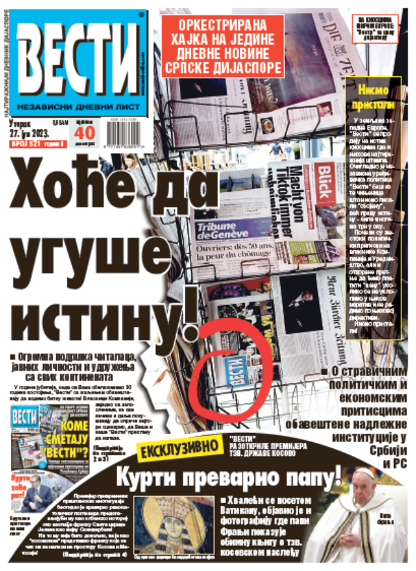 Dragi prijatelji, vlasnici i uredništvo “Vesti” vode do sada najtežu borbu da Srbi u dijaspori ne ostanu bez svog jedinog dnevnog glasila na maternjem jeziku. O tome nikad nismo govorili, ali protiv sebe smo od osnivanja imali razne političke i ekonomske interese, brojne mešetare i secikese, ali i one kojima je bilo u interesu da Srbi po svaku cenu izgube svoj identitet i ostanu bez svog lista.