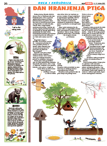 Svakog trećeg vikenda oktobra meseca slavi se Međunarodni dan hranjenja ptica. Ptice u prirodi uglavnom pronalaze dovoljne količine hrane da prežive zimu. Broj koji će doživeti proleće zavisi od toga koliko će zima biti jaka. Tokom zime s dugotrajnim snžnim pokrivačem i velikim minusima, uspeh preživljavanja ptica se smanjuje jer mnoge uginu zbog nenalaženja dovoljno hrane. Postavljanjem hranilica povećavaju se šanse da prebrode težak period. Naše malo njima znači život.