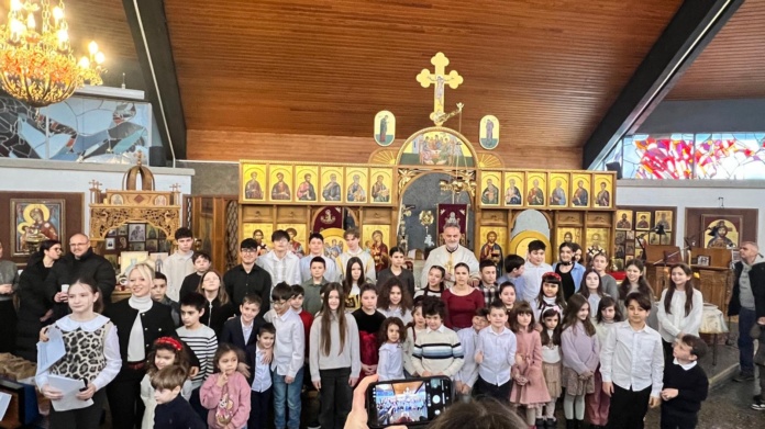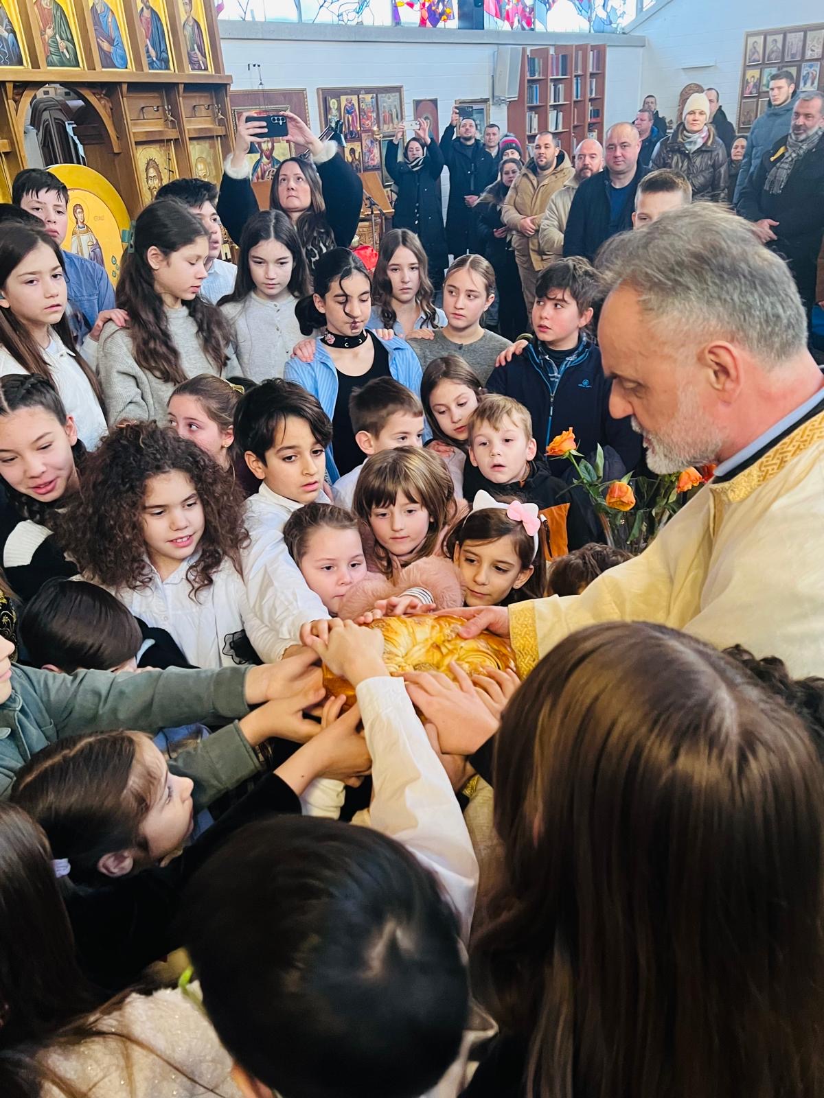Učenici nastave na srpskom jeziku, koju organizuje Ministarstvo prosvete Republike Srbije i koordinatorka Tatjana Hot, sa svojom profesorkom Slađanom Dunjić Fridrih okupili su se u hramu da proslave školsku slavu.