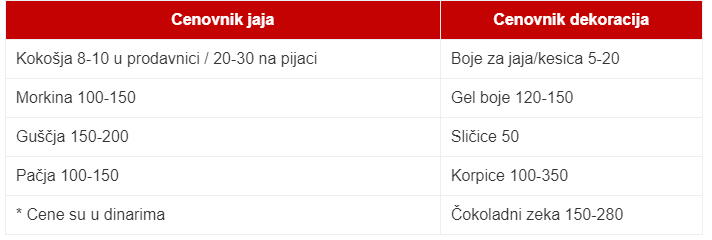 Objašnjava i da je većoj ponudi jaja na tržištu doprinela pandemija, zbog koje je smanjen izvoz, kao i potrošnja usled zatvorenih ugostiteljskih objekata. Inače, cena uskršnje dekoracije i boja za jaja takođe se razlikuje na pijaci i u marketima. Kesica boje za jaja u prodavnici košta pet-šest dinara, a na pijaci čak 10 do 20 dinara. Cena korpica je u prodavnici od 150 do 250 dinara (zavisi od veličine), a na pijaci od 200 do 350.