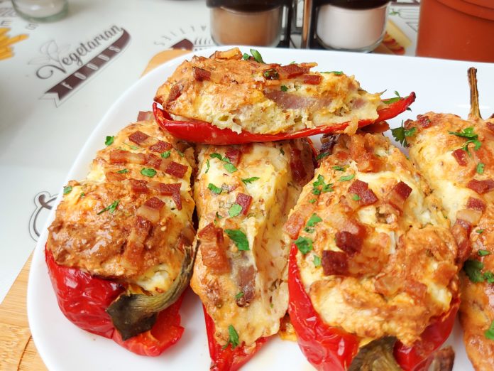 Na papriku rasporediti nadaev a odozgo rasporediti sitno seckanu suvu slaninu.