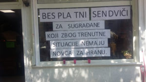 Lana Serdar, Miloševa majka, priča nam da kupci dođu u lokal i kad vide natpis ostavljaju bakšiš za akciju deljenja sendviča, donirajući onoliko koliko mogu.
