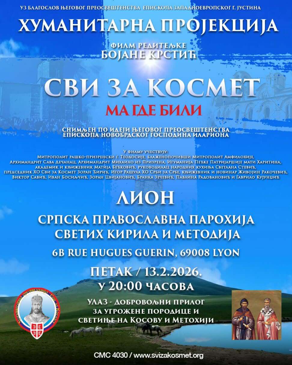 Humanitarna organizacija „Svi za Kosmet“ iz Beograda organizuje humanitarnu projekciju filma „Svi za Kosmet, ma gde bili“ u Francuskoj.