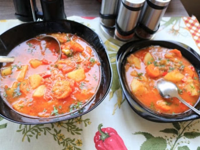 Propržiti junetinu na ulju par minuta da dobije koricu, zatim izvaditi iz šerpe. U isto ulje staviti sitno iseckano povrće i propržiti. Vratiti junetinu u šerpu. Promešati, začiniti i naliti sa malo temeljca. Nastaviti kuvanje. Nakon dvadesetak minuta dodati još temeljca. Kuvati dok meso ne bude bas mekano, po potebi dodavati temeljac. Za kraj smanjiti temperatru i dodati dve kafene kašičice začinske paprike, vrlo malo suvog začina i soli i jednu do dve kašičice brašna. Promešati, dodati iseckan krompir, i jedan paradajz. Naliti i ostaviti da se krčka još 20-25 minuta. Dodati sveži peršun.