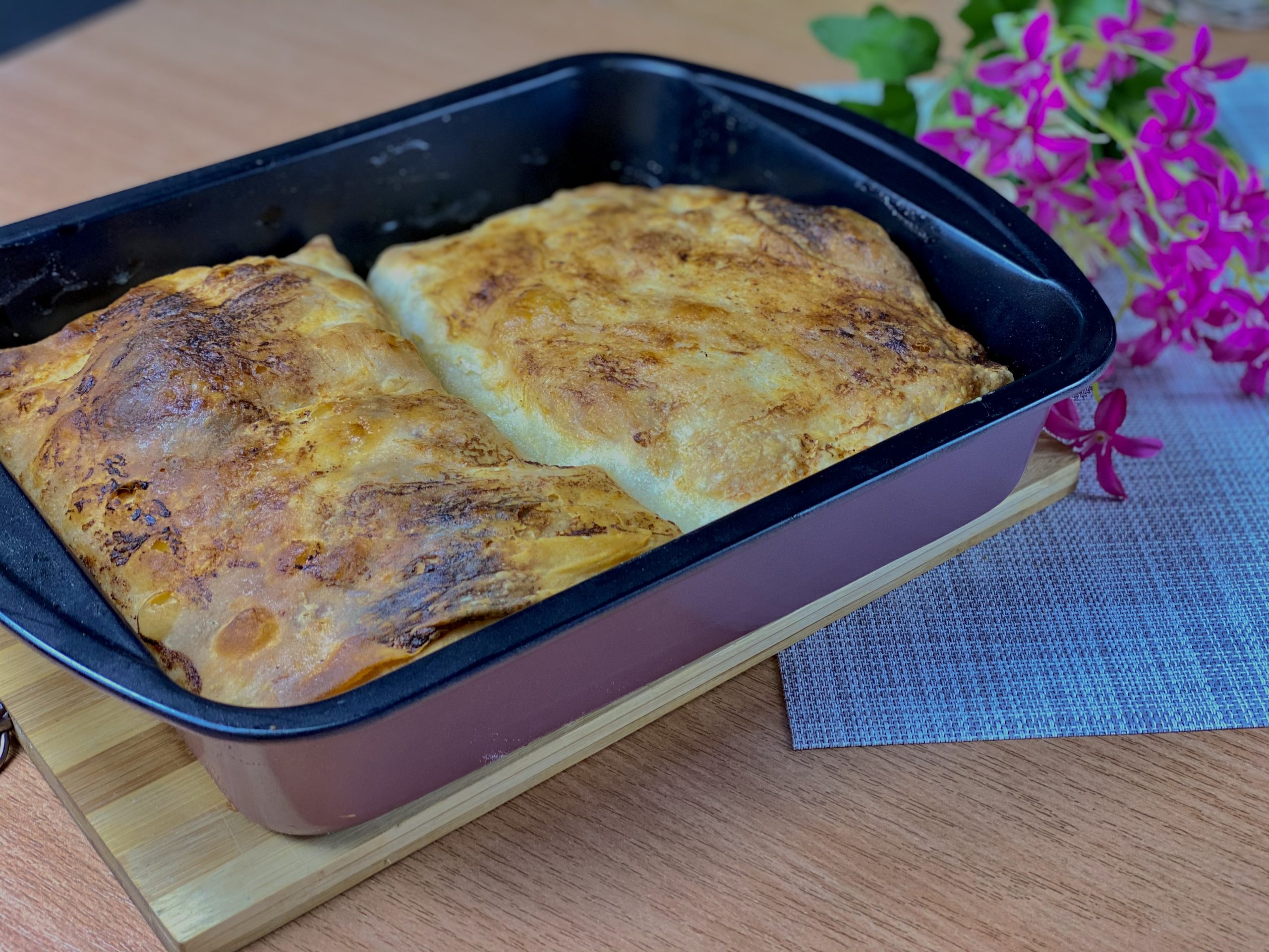 Umesiti glatko testo pa ostaviti da naraste. Nakon toga ga podeliti u dva dela, svaki deo premesiti i napraviti manji krug. Premazati uljem. Razvući kore rukom pa mazati prelivom. Preklopiti više puta. Peći na 180 stepeni 20-25 minuta. Prijatno!