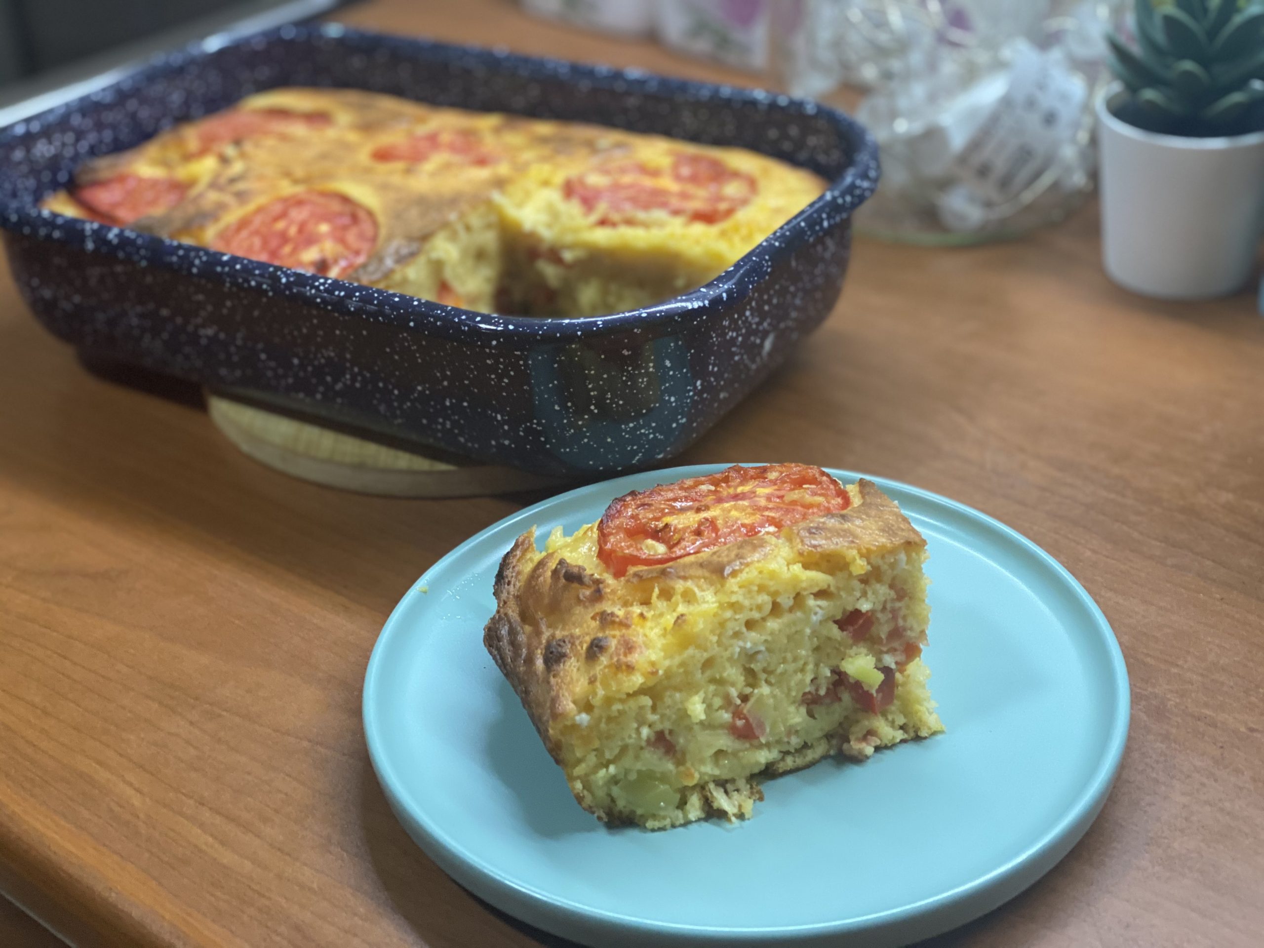 Iseckano povrće propržiti na puteru. U sir dodati jaja, prašak za pecivo, so, kefir, brašna i lepo sjediniti. Dodati i povrće i umutiti. U pleh za pečenje sipati ulje te zagrejati u rerni da bude vrelo, nakon toga sipati smesu. Po želji odozgo stavite kolutove paradajza. Peći na 180 C 25-30 minuta.
