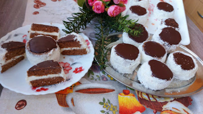 Odvojite žumance od belanaca i belance istucite u čvrt sneg. Žumancima dodajte šećer i tucite dok ne postane svetlo i penasto. Dodajte ulje i vodu i dobro promešajte. Brašno pomešajte sa praškom za pecivo, te ga dodajte u smesu jaja i šećera i mešajte dok se ne sjedini. Umešajte sneg od belanaca i smesu podelite na dva dela, te u jedan deo dodajte kakao.Ispecite dva biskvita, svaki posebno, u velikom plehu.Pecite ih na 180 stepeni 10-15 min. Manjim okruglim kalupom ili čašom iz oba biskvita isecite krugove (najbolje dok su biskviti još vrući). Prašak za puding pomešajte sa šećerom, vanilin šećerom i malo mleka, te ga ukuvajte u ostatak mleka. Puding ohladite, a zatim mu dodajte izrađeni maslac, te dobro izmešajte električnim mikserom. Na tamni krug od biskvita stavite kašičicu fila, razmažite i poklopite žutim krugom. Tako dobijenu „torticu“ premažite kfilom i sa strane (obod), te uvaljajte u kokosovo brašno.