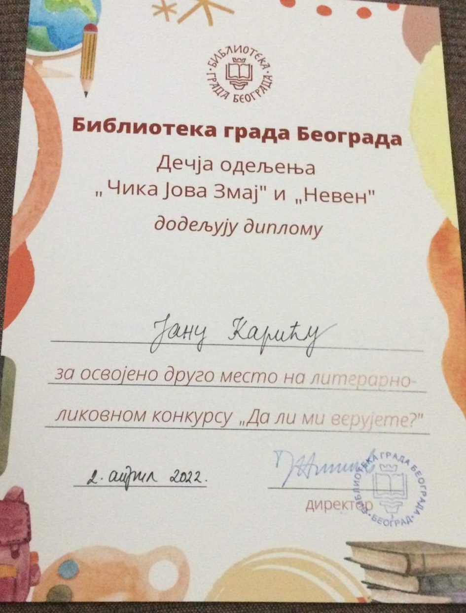Povodom 2. aprila, svetskog Dana knjige za decu, Dečja biblioteka “Zmaj” koja je deo Biblioteke grada Beograda raspisala je konkurs na temu: “Da li mi verujete?” Učesnici su imali zadatak da napišu pesmu, priču ili da nacrtaju crtež inspirisan stihovima Duška Radovića “Da li mi verujete”. Svako je mogao da izmašta neku nestvarno zanimljivu priču i da je pretoči u literarni sastav. I na ovom konkursu, kao i mnogim drugim prethodnim, učestvovali su i učenici Dopunske nastave na srpskom jeziku u nemačkim pokrajinama Bavarska i Baden-Virtemberg, koja je u organizaciji Ministarstva prosvete Srbije. Pohvale i nagrade, svakako, nisu izostale.