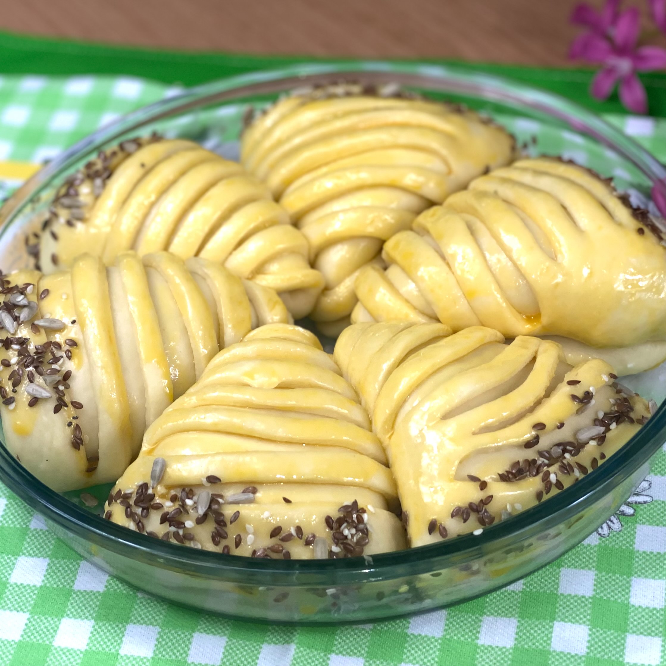 Kvasac aktivirati pa umesiti glatko testo. Ostaviti da naraste pa iseci u šest delova. Svaki deo puniti filom i praviti oblike. Staviti u nauljenu posudu za pečenje. Ostaviti da još malo naraste. Premazati žumancem i po obodima posuti semenkama po želji. Peći na 180 stepeni 30-35 minuta. Prijatno!