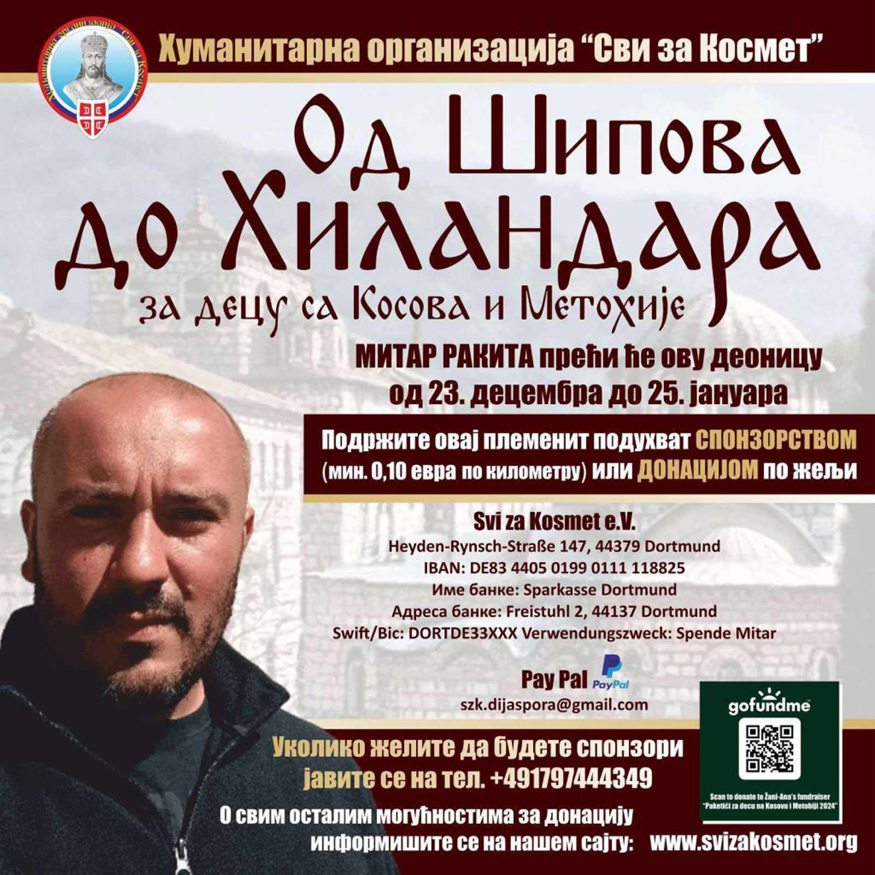 O čemu je reč? Rakita je odlučio da u saradnji sa Humanitarnom organizacijom “Svi za Kosmet” podrži srpski narod na Kosovu i Metohiji, tako što će šetati od Šipova do Hilandara i na taj način prikupiti novac za decu! Njegovu zamisao podržali su mnogi prijatelji, humanisti, pa su recimo Vladimir Ilić i Aleksandra Mirković Stakić sponzorisali ovaj poduhvat tako što plaćaju svaki pređeni kilometar po 0,30 evra. Tu su od starta i Žani Ana Radmilović, Veljko Kalkan, Nebojša Malinović, Milan Jeftenić i Dobrila i Mirko B, koji po pređenom kilometru doniraju po 0,10 evra.