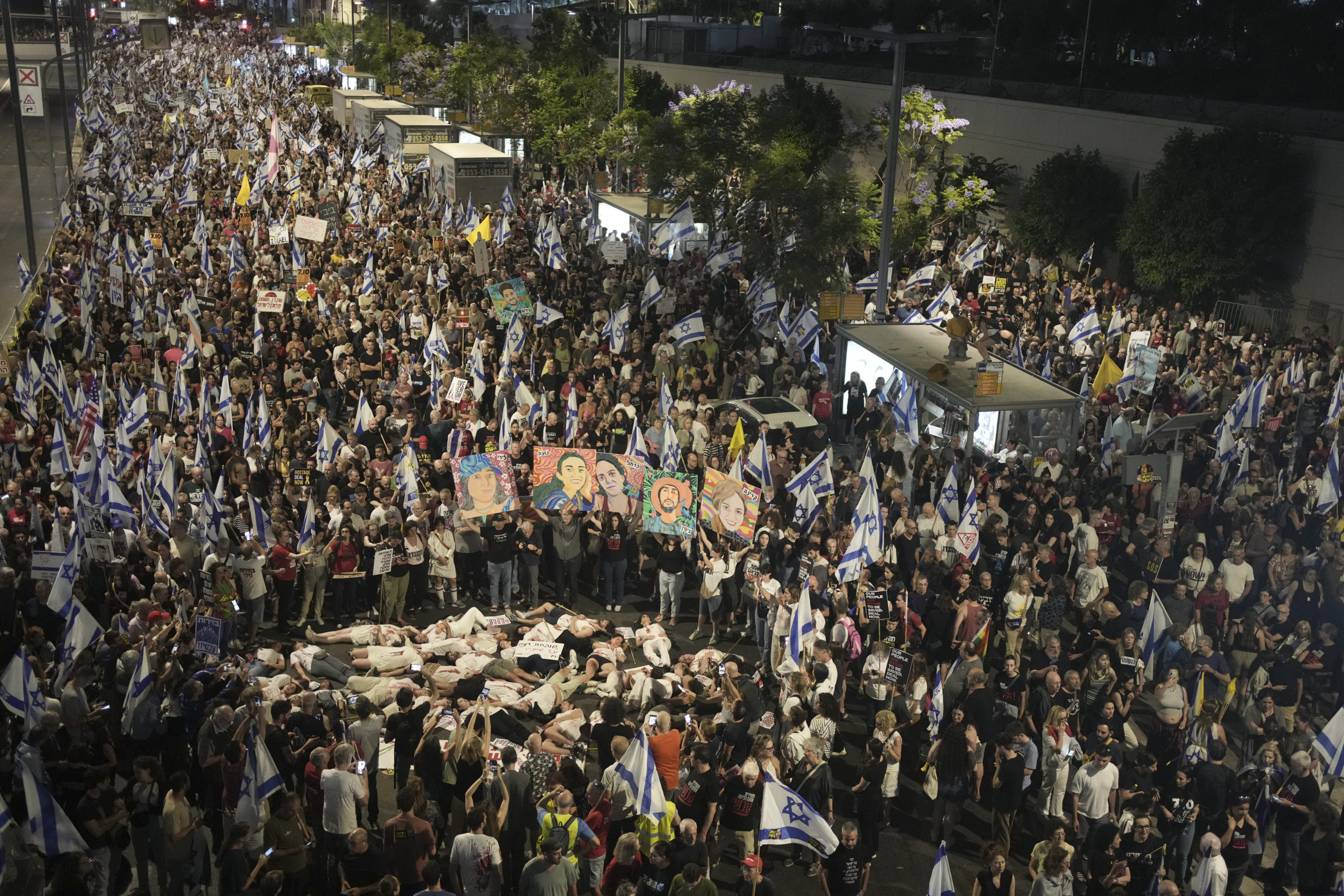 Demonstranti uzvikuju ”Onaj ko napusti, mora da vrati (taoce)“ i drže znakove u kojima se zahvaljuju Bajdenu na njegovoj izjavi kojom se poziva na prekid rata. Mnogi drže žute zastave, simbolične za taoce koje Hamas drži u Gazi.