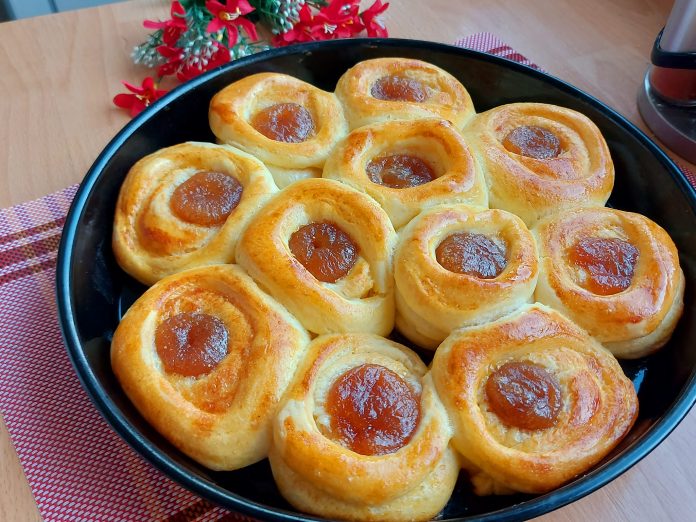 U sredinu staviti po želji slatki ili slani nadev. Ja sam stavila po smokvu iz tegle (kuvano slatko od smokava). Može staviti po želji džem, sir, krem…