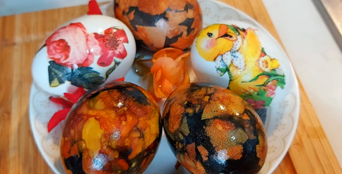 Salvete sa šarenim detaljima iseči,rukama iscepkati detalj pa odvojiti , i ostaviti najtanji deo gde je šara. Jaje premazati belancetom i prilepiti prozirnu salvetu, još premazati belancetom i i uljem i poredjati gde su ostala farbana jaja