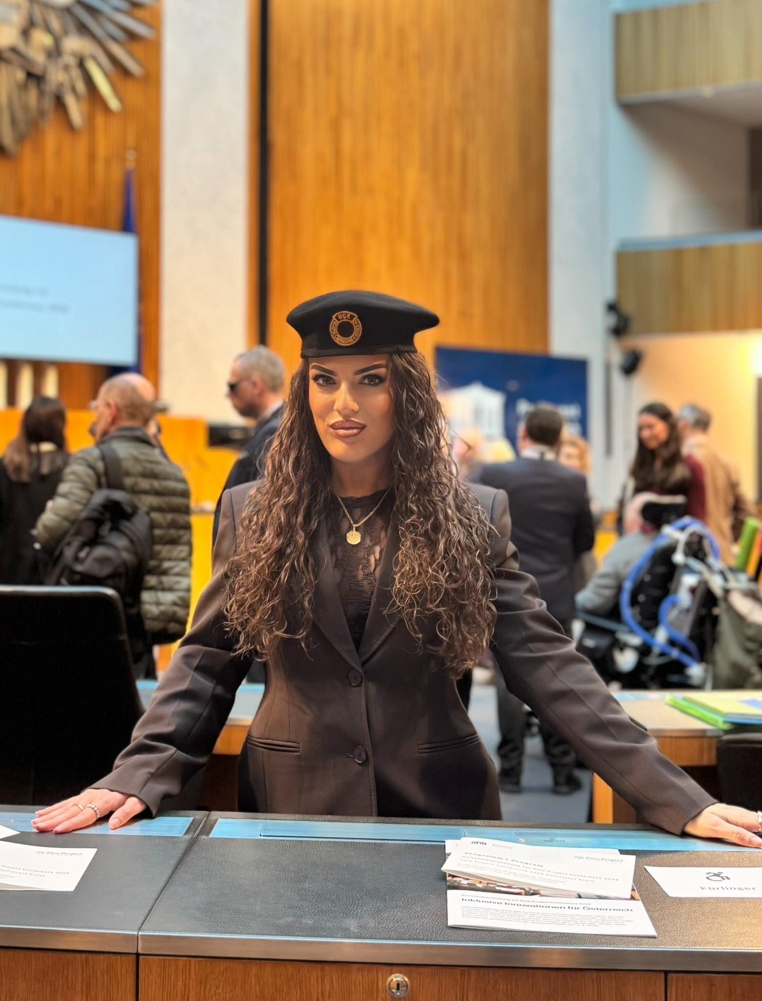 Naime, ambasadorka dobre volje za Kosovo pri Međunarodnom komitetu za ljudska prava Eljvane Šalja došla je danas na sastanak u austrijskom parlamentu noseći beretku sa amblemom OVK.