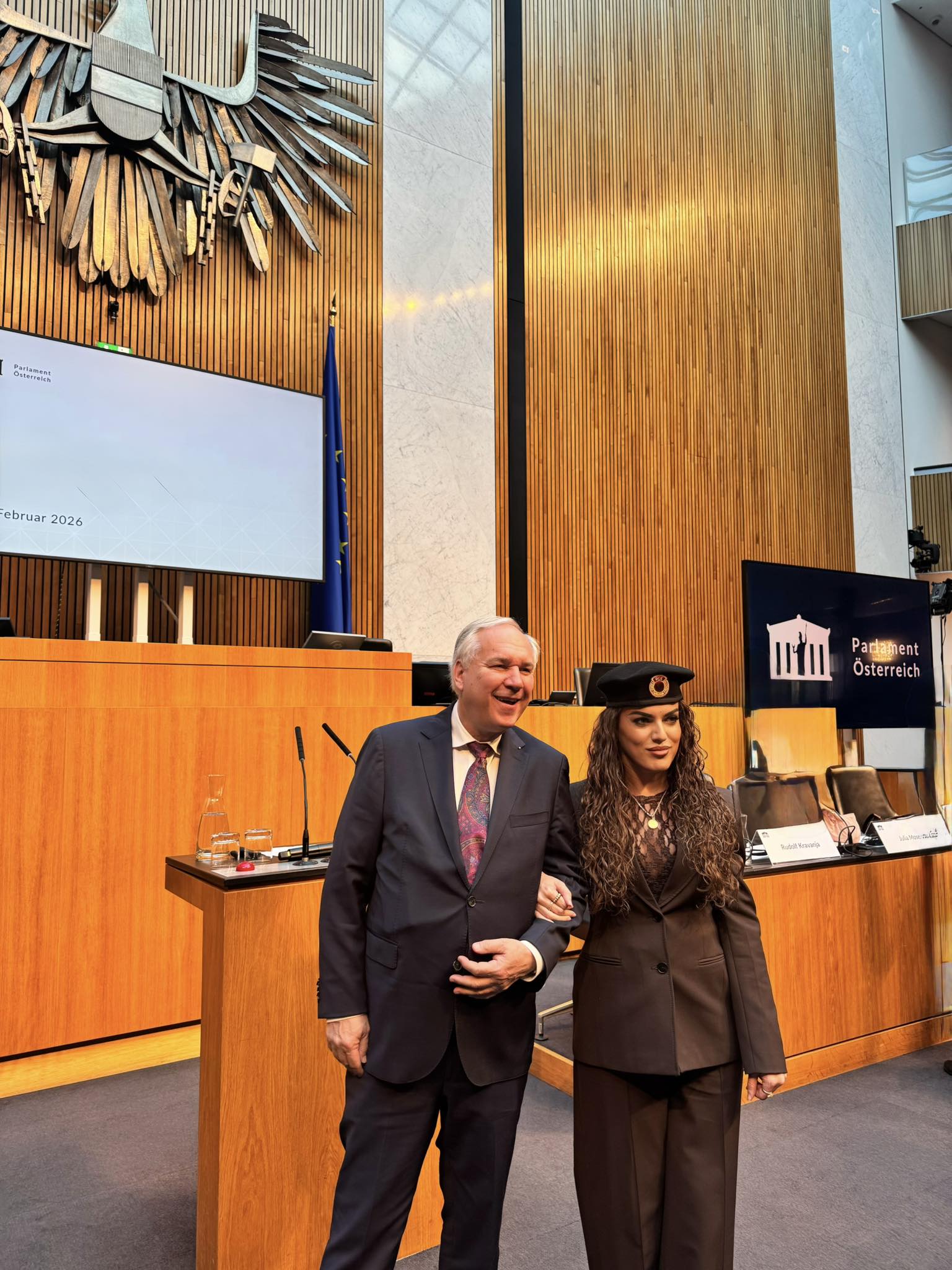 Ona se sa beretkom i amblemom OVK slikala u zdanju parlamenta, pa čak i ruku pod ruku sa predsednikom Skupštine Austrije Valterom Rozenkrancom.