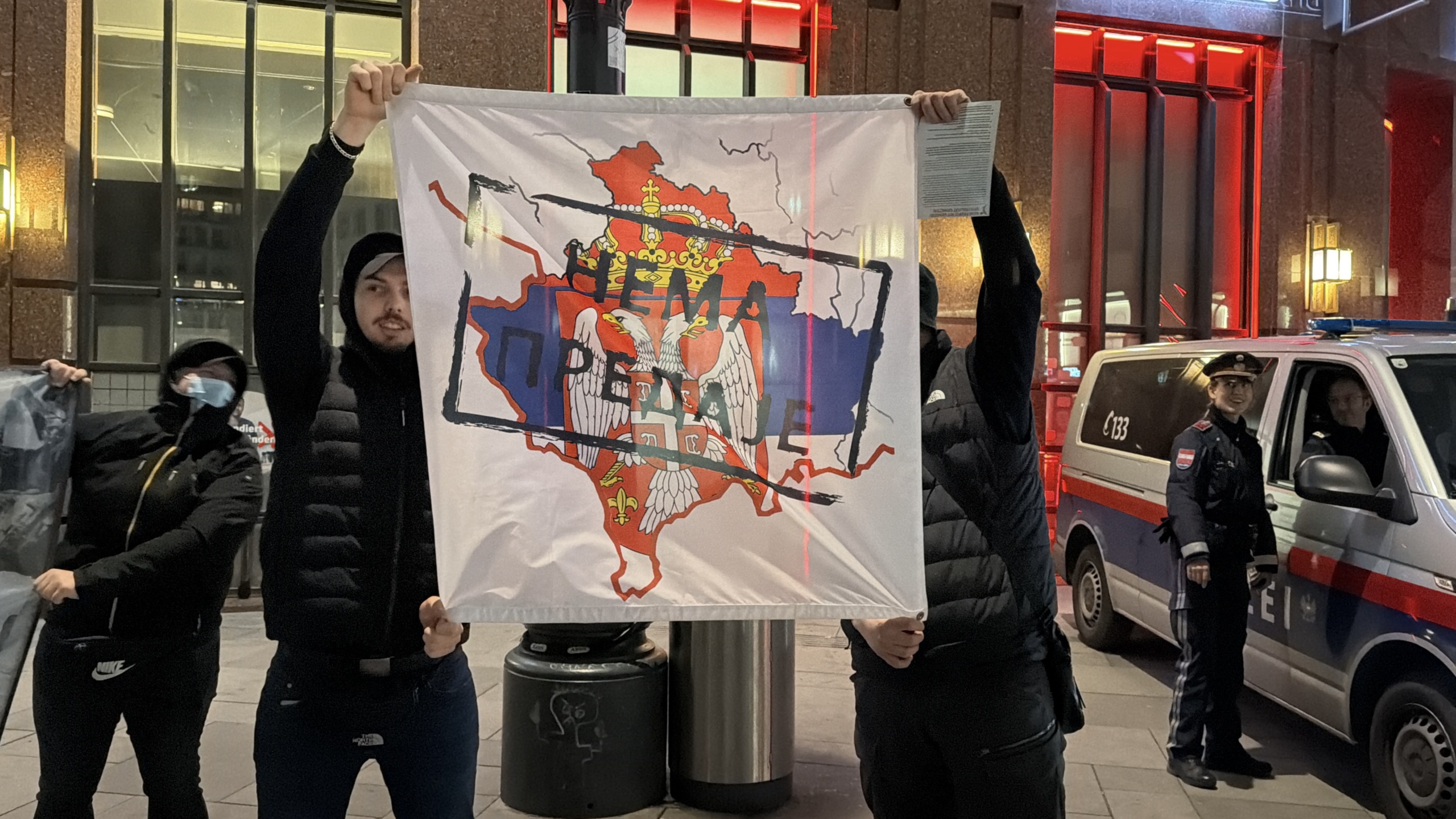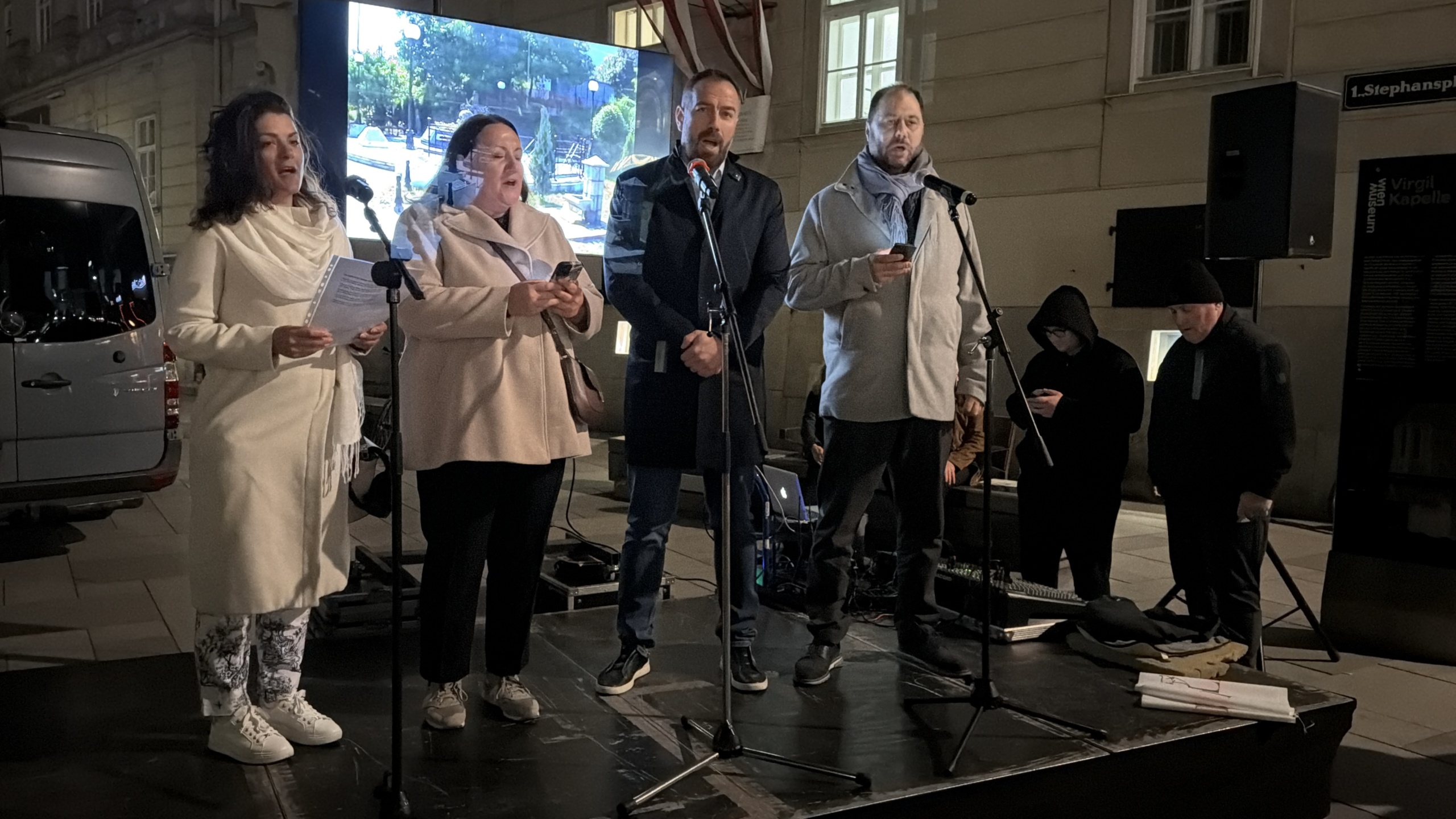 Među govornicima su bili ispred Srpsko-austrijskog pokreta solidarnosti Lazar Bilanović i David Štokinger, te Miloš Mirković iz SPKD Prosvjeta u Austriji i mirovni aktivisti Arnold Pavkovic, Andreas Vimer, Boris Letaler i Vilhelm Langtaler.