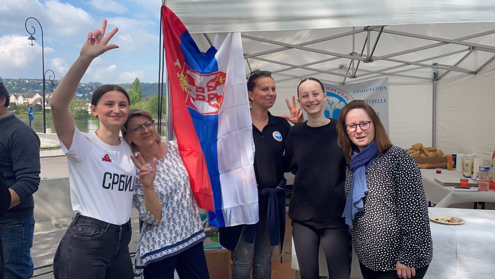 Srpska trobojka se vijorila Sansom, lepo su je razvili Dejan Mikić sa prijateljem Faridom Fereirom, na vrh glave stajala je šajkača, a u znak poštovanja Francuske, kao zemlje prijema, Loran i Nikola Saen slikali se sa galskim kacigama. Na štandu su bile izložene i dvojezične knjige posvećene Srbiji i Kosmetu. Kao u svemu prva i nezamenjiva je bila Vesna Savović, a u stopu su je pratile Anastasija i Tijana Radovanović, Danijela Simić, Marica Jeremić i Maja Milošević. Po uspomenama prebiru Milan Hadžić, Mile Jevđenjević, Vera i Srećko Glavinić, a u top raspoloženju bili su i Milijana Radovanović, Dragana Ranković, Eli Saen sa budućom suprugom Natašom, kao i veterani Ruža i Mirko Sabović. Veliko iznenađenje priredio je Luka Erić, koji je iz Ljubljane došao sa devojkom da čiči Goranu rođendan čestitaju. Tu su i Dragan Gavrilović, Dragan Ćirović, Melisa Revel, Saša Simić, kao i čika Bora Momčilović koji nigde ne ide bez svoje voljene.