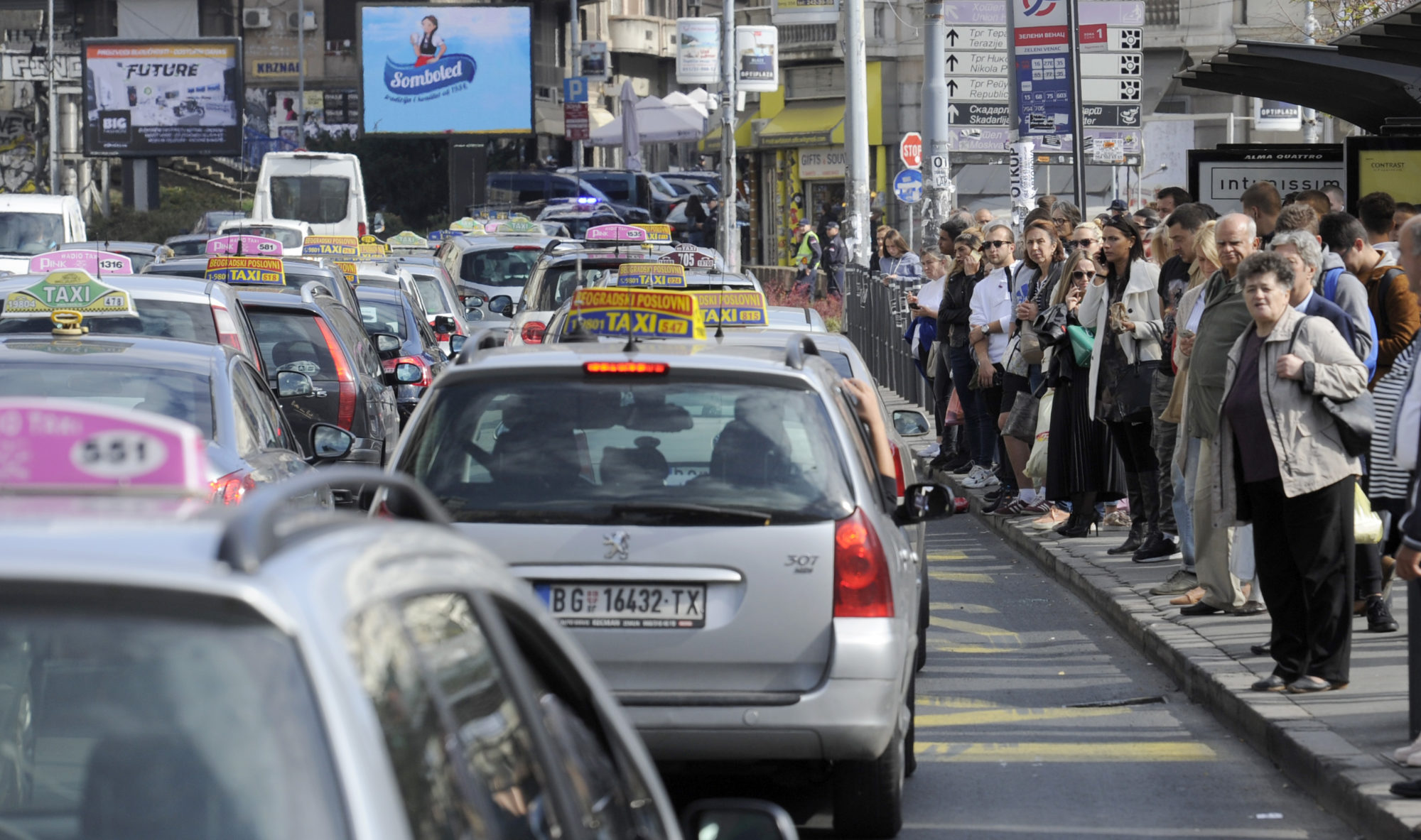 Taksisti su se i danas kao i prošle nedelje okupili na Obrenovačkom putu (Čukarica), u Bloku 70 (Novi Beograd), kod bivše hale “Pionir” (Palilula) i u Kumodraškoj ulici (Voždovac), a oko 15 časova bio je potpuno blokiran deo od Slavije do Savskog trga, Trg Nikole Pašica, Takovska i Kneza Miloša. . .