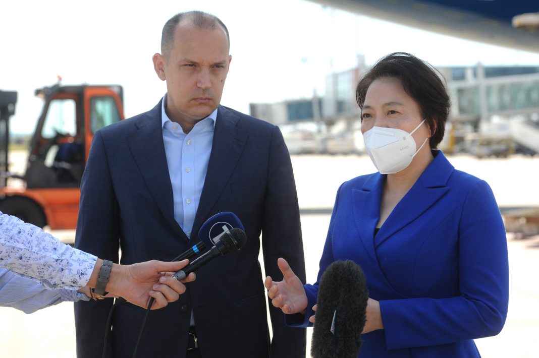 Ministar je vakcine na aerodromu dočekao s kineskom abasadorkom u Srbiji Čen Bo, koja je poručila da je raduje padu broja novozaraženih u Srbiji i dodala da je raduje dobar proces masovne imunizacije u Srbiji.