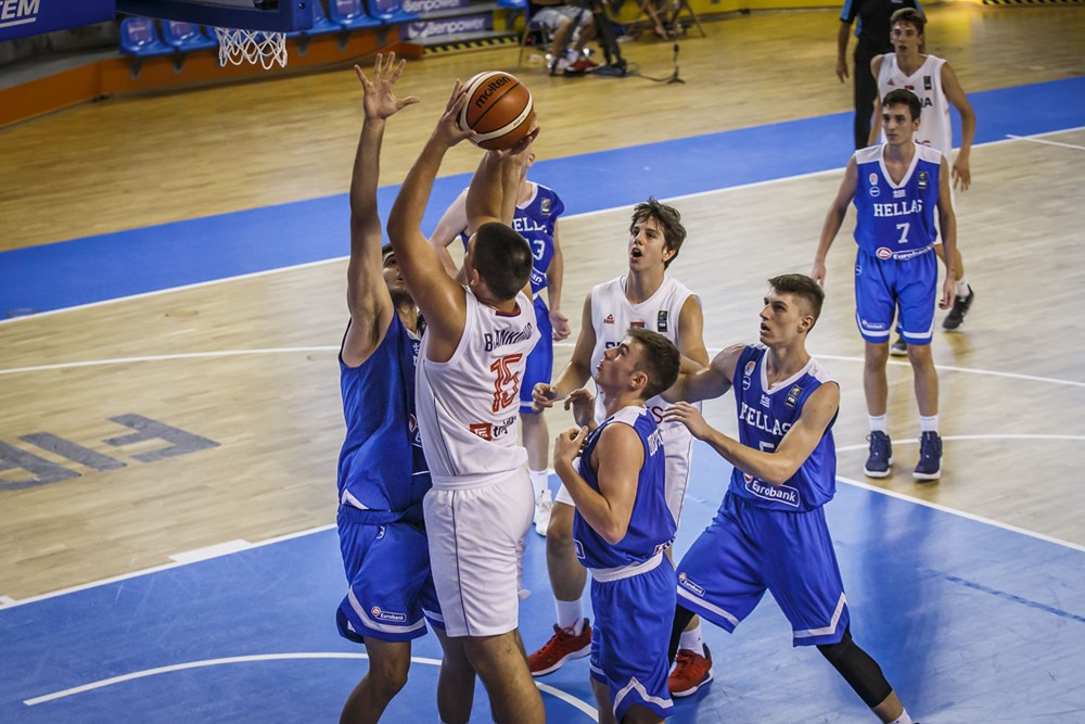 Izabranici selektora Saše Nikitovića u prvom kolu grupe D ubedljivo su savladali selekciju Grčke. Osim u prvoj četvrtini srpski kadeti su bili daleko bolji rival, dominantni u svim segmentima igre tako da se njihov trijumf nijednog trenutka nije dovodio u pitanje: 77:55 (9:16, 28:8, 23:19, 17:12).